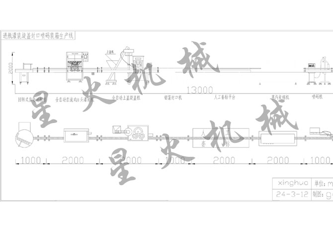 理瓶2頭灌裝真空旋蓋貼標噴碼收瓶及開箱封箱打包生產(chǎn)線