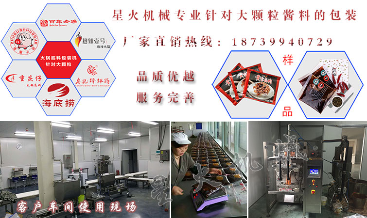 醬料包裝機系列是星火機械力推的一系列包裝設(shè)備,也是銷售量較好的機械設(shè)備,該系列包裝機主要對顆粒醬料及粘稠醬料進行包裝,如:火鍋底料、豆豉醬、辣椒醬、牛肉醬等各種調(diào)料的包裝,目前我司已經(jīng)與很多知名醬料企業(yè)合作,歡迎廣大新老客戶前來我司考察監(jiān)督。下面幾款醬料設(shè)備就是星火賣的比較好的幾款醬料包裝機產(chǎn)品。